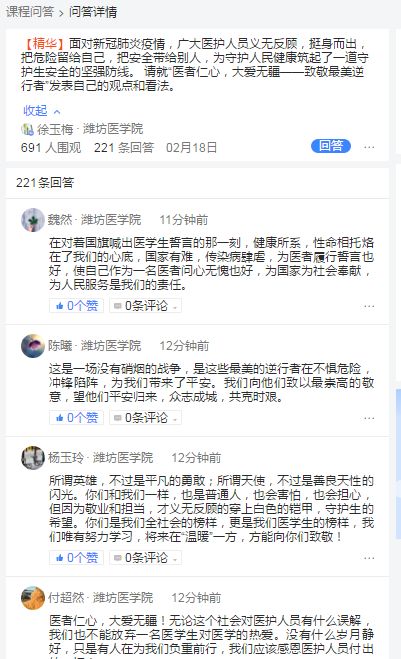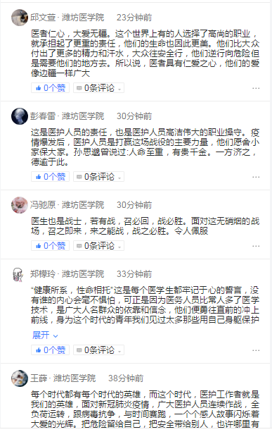 “所谓英雄,不过是平凡的勇敢;所谓天使,不过是善良天性的闪光。你们和我们一样也是普通人,也会害怕,也会担心,但因为敬业和担当,才义无反顾的穿上白色铠甲,守护生的希望。你们是我们全社会的榜样,更是我们医学生的榜样,我们唯有努力学习,将来再“温暖”一方,方能向你们致敬。”这是康复医学院杨玉玲同学在“首堂思政在线课”发起的话题讨论上的留言。