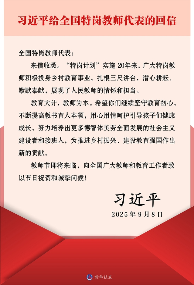 新华社北京9月9日电 在第四十一个教师节来临之际,中共中央总书记、国家主席、中央军委主席习近平给全国特岗教师代表回信,提出殷切希望,并向全国广大教师和教育工作者致以节日祝贺和诚挚问候。